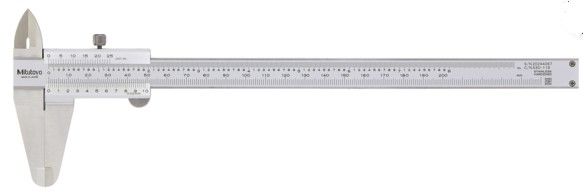 A Mitutoyo dual-scale, high accuracy/resolution vernier caliper equipped with standard outside and inside jaws. Hardened stainless steel construction with easy-to-read, satin-chromed scales.