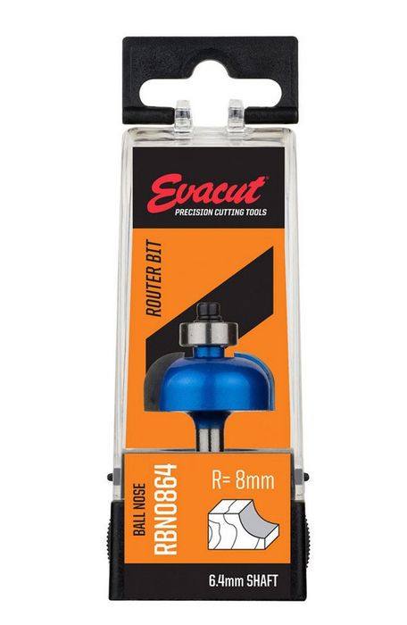 - Ball Nose Router Bit 8mm Radius x 14mm Cutter Height x 29mm Dia x 6.4mm Shank - Evacut