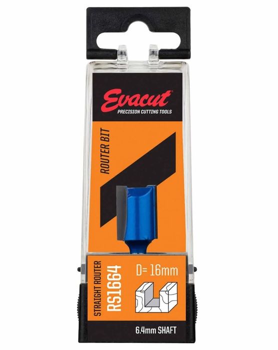 - Straight Router Bit 2 Flute x 16 mm Diameter x 19mm Flute length x 6.4mm Shank - Evacut