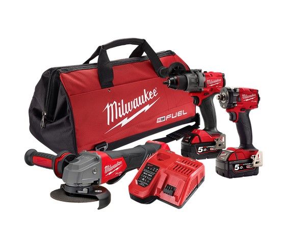 M18 FUEL 13mm Hammer Drill/Driver, M18 FUEL 1/2" Compact Impact Wrench with Friction Ring, M18 FUEL 125mm (5") Angle Grinder with Deadman Paddle Switch, (2) M18 REDLITHIUM-ION 5.0Ah Battery, M12 & M18 Rapid Change