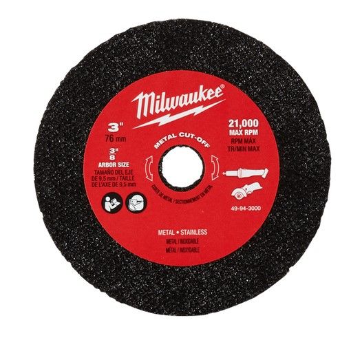 The Milwaukee® 49943000 is a three pack of 76mm x 1mm x 10mm (3” x .040" x 3/8”) cut-off wheels. Rated for a maximum 21,000 RPM this disc is an ideal solution for cutting stainless steel and other metals quickly and efficiently. These metal cut-off wheels are suitable for use with the M12 FUEL™ Cut-Off Tool (M12FCOT-0).