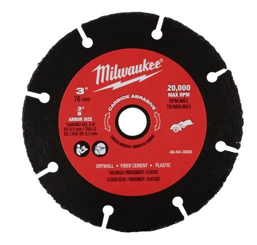 The Milwaukee® 49943005 is a 76mm x 1mm x 10mm (3” x .040" x 3/8”) cut-off wheel. Intended to be a general-purpose wheel when paired with the Milwaukee M12 FUEL™ Cut-Off Tool (M12FCOT-0), this wheel is a unique solution that delivers the capability to cut a wide range of materials quickly and efficiently. Whether it’s drywall, cement backer board, PVC, plastics, etc., carbide abrasive wheels are suitable for the task when used with the M12 FUEL™ Cut-Off Tool (M12FCOT-0).