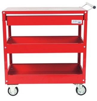 3 Tier Tool Cart Trolley for safe transfer of tools and parts around the workshop. Includes easy-access drawer. Lockable rear wheels. Robust steel construction.