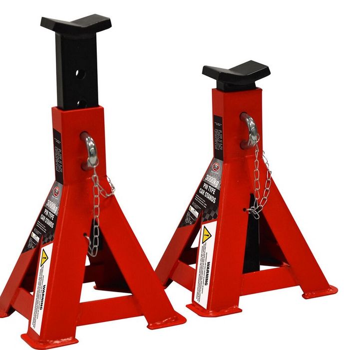 Keep you and your car safe with a pair of these SCA Pin Car Stands. Finished in gloss red and black powder coating these car stands are resistant to corrosion, abrasion and most shop fluids. Featuring a robust twin pin system to utilise the full lifting height of your jack these stands provide you with safe level support. The pins are kept in place with small R-clips and are attached to the body of the stand by a short chain to protect them from loss. One pair of stands will support up to 3000kg, suitable for medium to heavy duty vehicles.