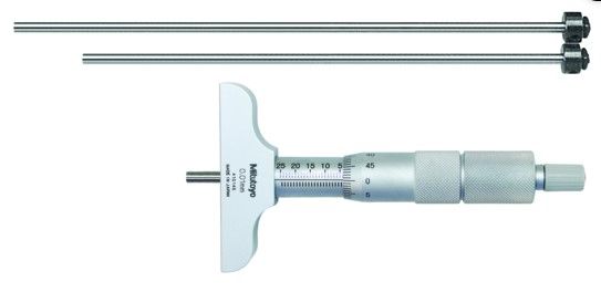 A Mitutoyo non-digital depth micrometer using interchangeable measuring rods to cover a wide measuring range. The 60mm base is made from tool steel, hardened and ground with a micro-lapped reference surface.
