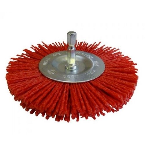 - Brush Wheel 100mm 80g 6.3mm Hex Spindle Red Abrasive Nylon