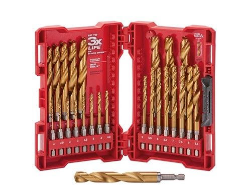 The Milwaukee SHOCKWAVE Red Helix 25-piece drill bit kit is designed for drilling most materials. The 135 degree split point tip of this drill bit starts engaging the material on contact for fast starts. Chip Breaker splits up the size of the material from the cutting edge thereby minimizing heat build-up. It provides enhanced productivity when drilling and fastening. Variable Helix offers solution to cutting V. clearing material removal.