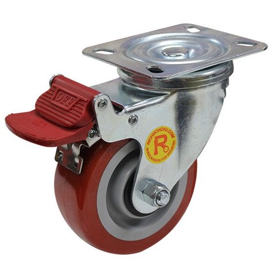 Wheel Diameter: 100mm Castor Frame Type: Swivel with Brake Wheel Width: 35mm Wheel Type: Polyurethane Wheel Code: PU4408 Wheel Bearing Type: Roller Bearing Castor Height: 130mm Swivel Radius: 125mm Maximum Load Capacity: 200kg Recommended Load Capacity: 150kg Meeting and exceeding all performance standards due to a higher load bearing capacity the 300 Series has a wide range of uses.A sturdy pressed metal castor with a variety of wheel options, Richmond can help identify the correct wheel for your application and environment. A nylon wheel in a 300 series is most common for industrial and trolley applications, a rebound rubber wheel is ideal for road cases, transportable crates whilst a poly nylon wheel is best suited to undercover and showroom displays. Cast Iron, Poly Cast Iron and Aluminium wheels are also available with this series The S4044B from Richmond is a swivel frame castor and uses a polyurethane wheel. This swivel castor is in our 300 series plate range and can safely take loads up to 200kg. The S4044B is assembled with roller bearings on the castors axle and is baseplate mount. The swivel frame design of this castor permits the load to be steered. The outside diameter of the polyurethane wheel is 100mm, the wheel width is 35mm