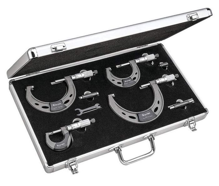 The Starrett S444.1 Metric Outside Micrometer Set includes 25mm, 50mm, 75mm, and 100mm micrometers, three standards, adjusting wrench, in case. A popular precision micrometers used by skilled workmen worldwide. This model features 0-100mm Measuring Range. Smooth friction thimble for uniform pressure, the combination ratchet and speeder for uniform pressure and quicker adjustment, or a plain micrometer that depends on your own “feel”. Recommended for mechanics, automotive service and machine shops, toolrooms, inspection departments and wherever gaging involves a wide range of measurements. SET, 0-100mm, 0.01mm Grad, Carbide Faces, Ratchet Stop, Lock Nut involves a wide range of measurements.