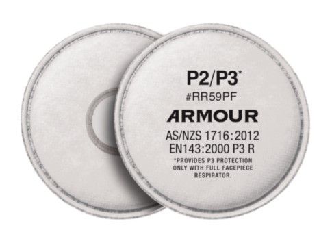 Welcome to Armour's range of reusable respiratory masks, filters, cartridges, kits and accessories. Armour's P2 Particle Filter replacement pads for protection against mechanically and / or thermally generated particles. For use with respiratory masks. To meet P3 standards, you require a Full Face Mask with a Particulate Filter. The particulate filters protect against a range of mechanically and/or thermally generated particles from wood, steel or concrete. Features and Benefits Multi-fit bayonet connection Protection against P2 particles - (P3 protection if used with a full face respirator Particulate protection with an extra carbon active layer for nuisance level organic vapours and acid gasses for welding High filtration level effective to 99.9% of particles Protects against airborne contaminants Suitable for welding fumes, dusts, smoke and biological agents. Designed to work with Armour full face and half face respiratory masks - sold separately. All Armour reusable respiratory products are tested and approved to meet the following standards: Certified AS/NZS 1716:2012 Certified CE Standard EN143:2000 P3 R Certified CE Standard EN14387:2004+A1:2008 Certified CE Standard EN149:2001+A1:2009 Certified CE Standard EN143:2000 P2 R