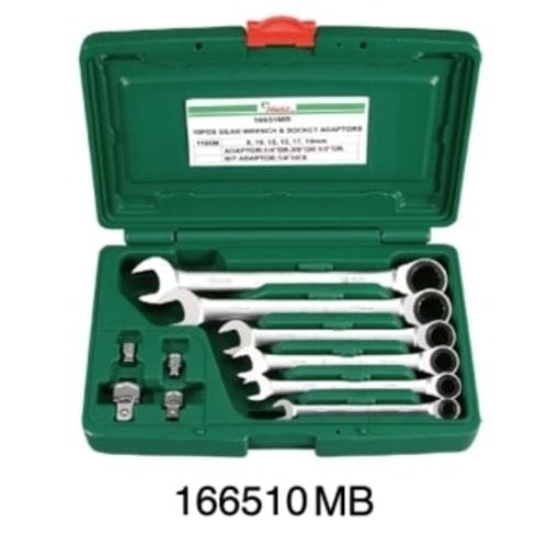 - 8-19mm 10 piece Gear Wrench & Socket Adaptor Set 1/4'',3/8'' & 1/2'' in ABS Case - Hans