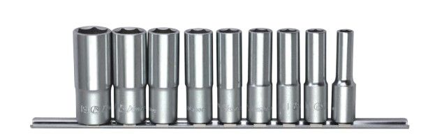 - 3/8" Dr 9Pc Deep Socket Set on Rail 5/16"-13/16" 12 Pt